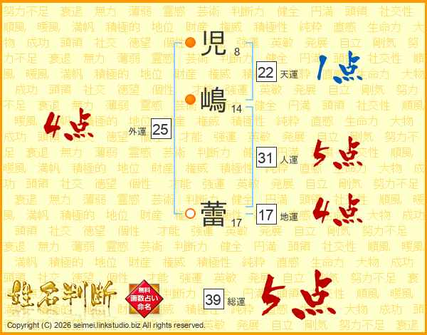 児嶋蕾さんの総運は39画の5点!