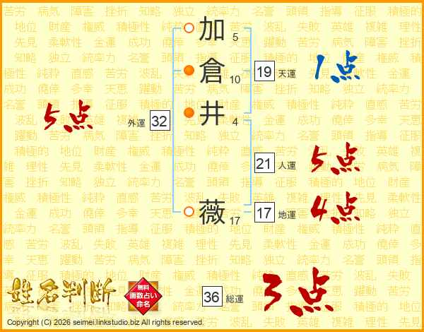 生活面を象徴する運勢です。外部から受ける影響力を表し、結婚運、家庭運や職場、環境への順応性を表します。総運から人運を引いた画数。姓や名が1文字の場合を除く。