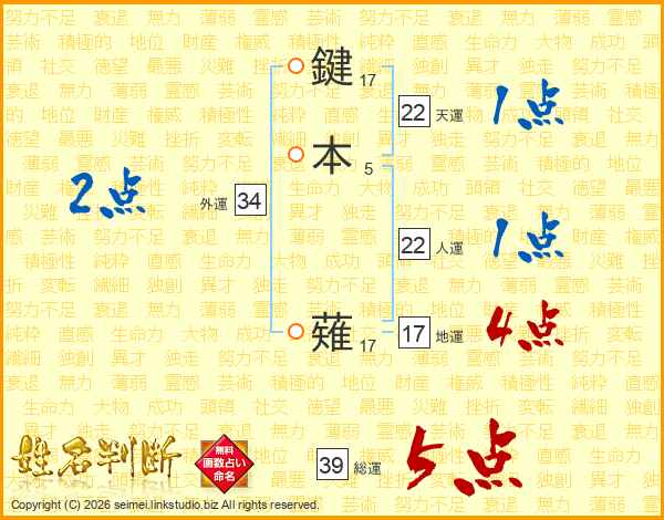 あなたの人生を表す1番重要な運勢です。生涯を通じて影響する総合運となり、主に50歳以降の晩年期に影響を及ぼします。苗字と名前の合計画数。