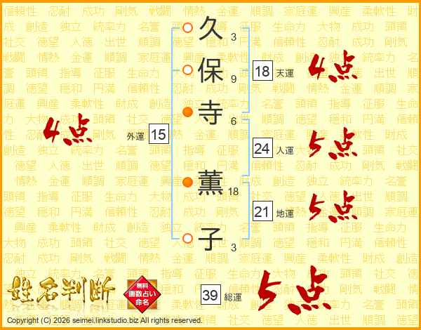 久(3画)保(9画)寺(6画) 薫(18画)子(3画)
