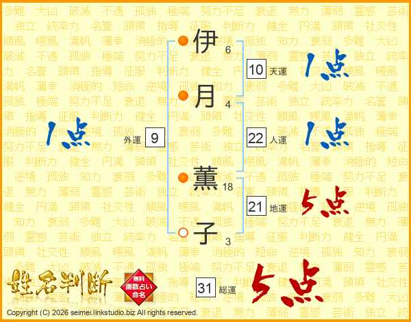 伊(6画)月(4画) 薫(18画)子(3画)