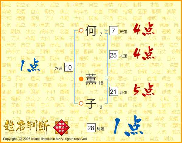 何(7画) 薫(18画)子(3画)