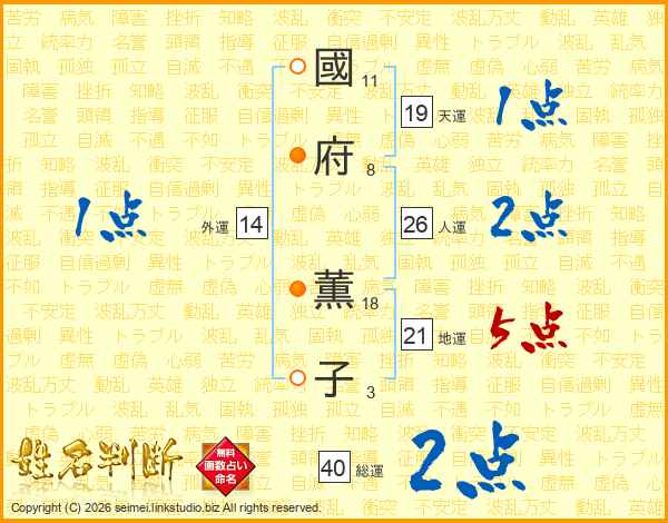 國(11画)府(8画) 薫(18画)子(3画)
