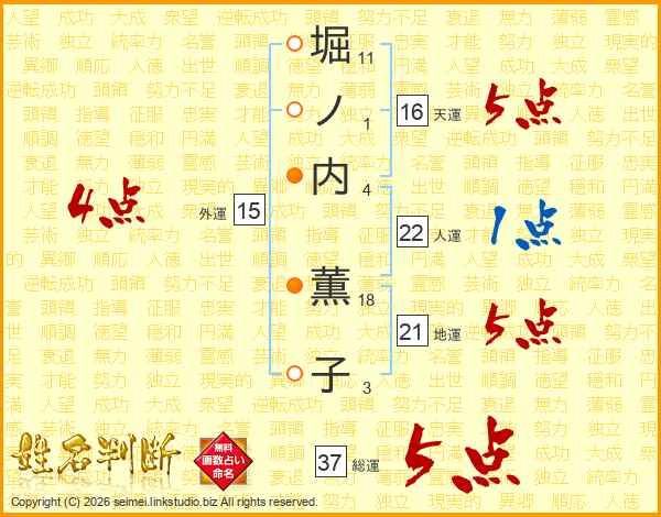 堀ノ内薫子さんの総運は37画の5点!