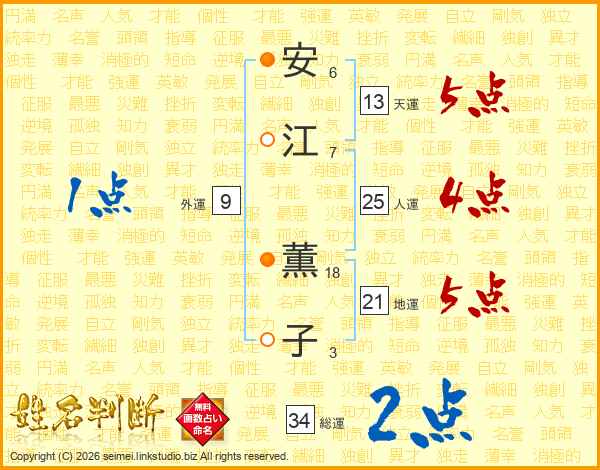 安(6画)江(7画) 薫(18画)子(3画)