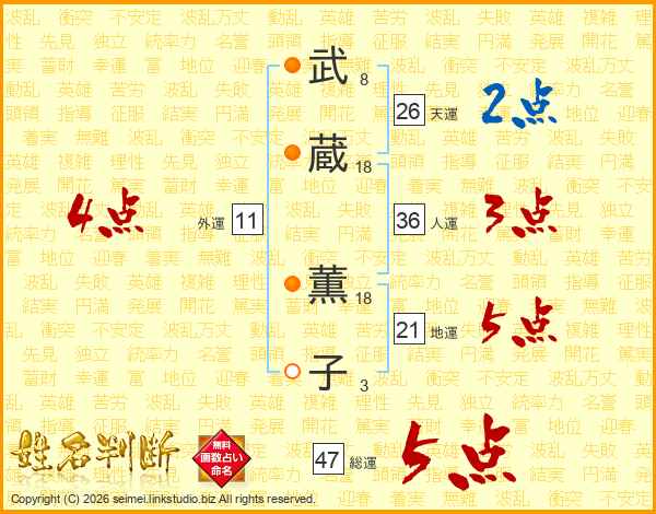 武(8画)蔵(18画) 薫(18画)子(3画)