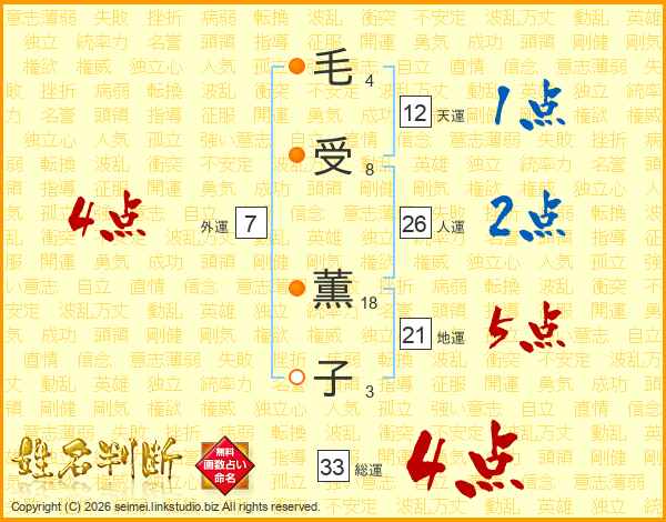 生活面を象徴する運勢です。外部から受ける影響力を表し、結婚運、家庭運や職場、環境への順応性を表します。総運から人運を引いた画数。姓や名が1文字の場合を除く。