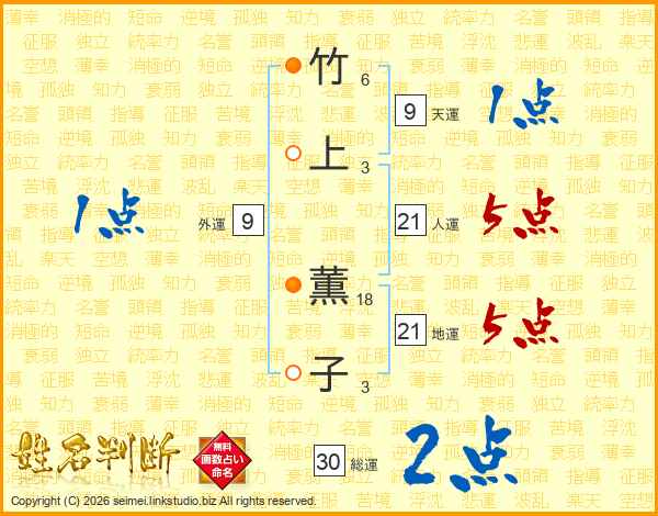生活面を象徴する運勢です。外部から受ける影響力を表し、結婚運、家庭運や職場、環境への順応性を表します。総運から人運を引いた画数。姓や名が1文字の場合を除く。