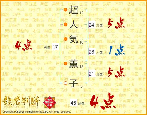 超(12画)人(2画)気(10画) 薫(18画)子(3画)