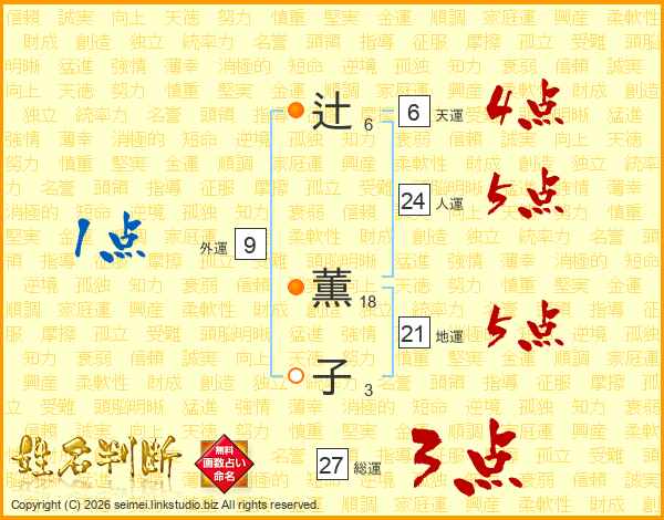 家系が持つ宿命的な運勢を表します。祖先から受け継いだ苗字ですので自分の力が及びません。家柄を象徴します。苗字の合計画数。