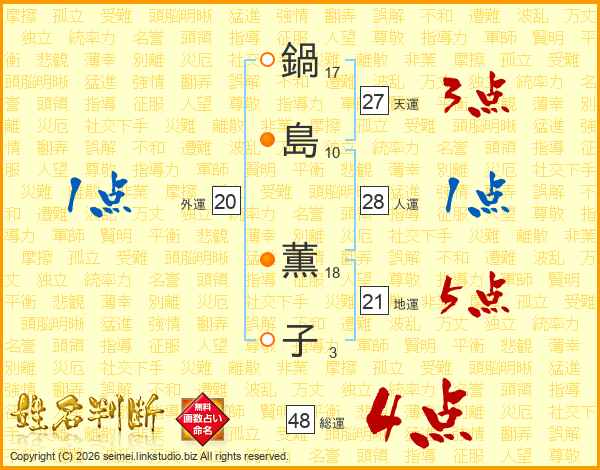 鍋(17画)島(10画) 薫(18画)子(3画)
