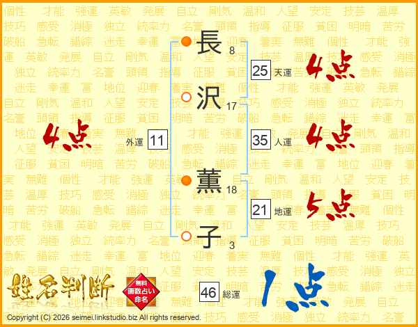 長(8画)沢(17画) 薫(18画)子(3画)