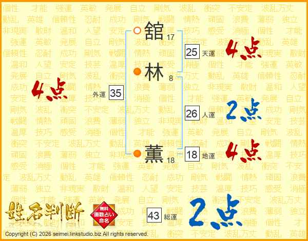 生活面を象徴する運勢です。外部から受ける影響力を表し、結婚運、家庭運や職場、環境への順応性を表します。総運から人運を引いた画数。姓や名が1文字の場合を除く。