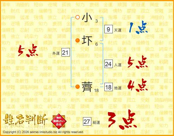 生活面を象徴する運勢です。外部から受ける影響力を表し、結婚運、家庭運や職場、環境への順応性を表します。総運から人運を引いた画数。姓や名が1文字の場合を除く。