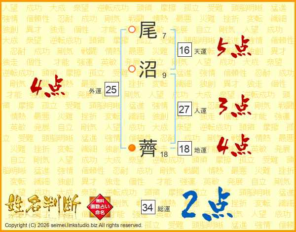 生活面を象徴する運勢です。外部から受ける影響力を表し、結婚運、家庭運や職場、環境への順応性を表します。総運から人運を引いた画数。姓や名が1文字の場合を除く。
