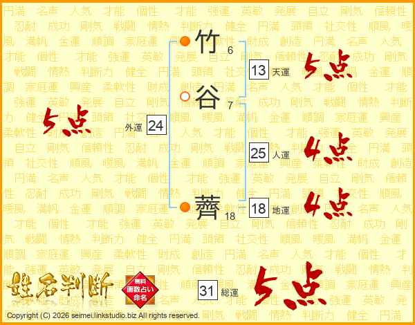 竹谷薺さんの総運は31画の5点!