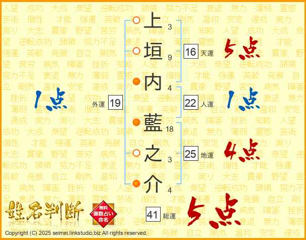 上(3画)垣(9画)内(4画) 藍(18画)之(3画)介(4画)