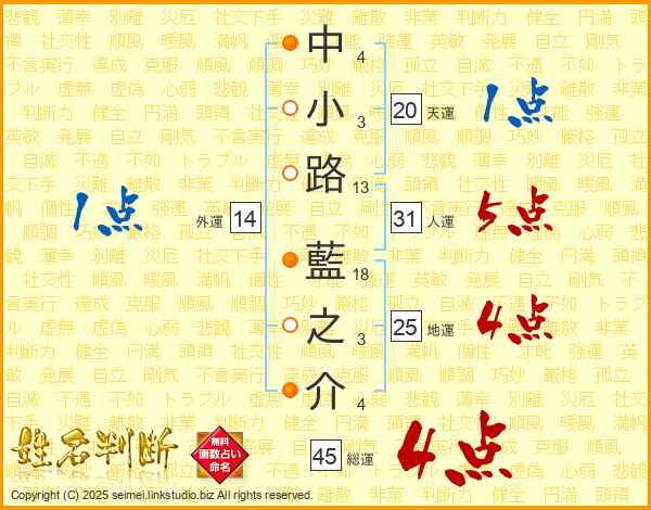 あなたの人生を表す1番重要な運勢です。生涯を通じて影響する総合運となり、主に50歳以降の晩年期に影響を及ぼします。苗字と名前の合計画数。