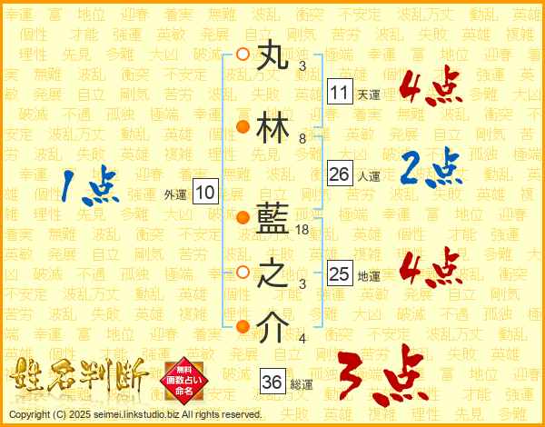 丸(3画)林(8画) 藍(18画)之(3画)介(4画)