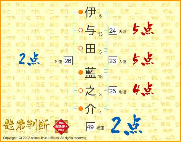 伊(6画)与(13画)田(5画) 藍(18画)之(3画)介(4画)