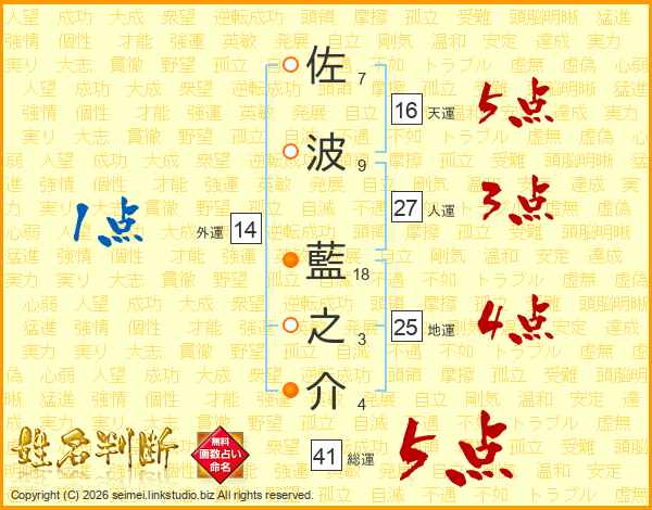 佐(7画)波(9画) 藍(18画)之(3画)介(4画)