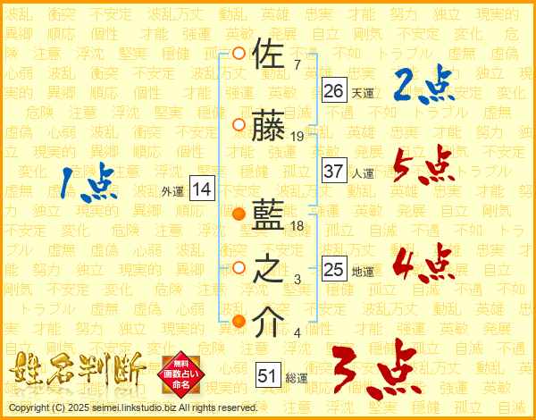 佐(7画)藤(19画) 藍(18画)之(3画)介(4画)