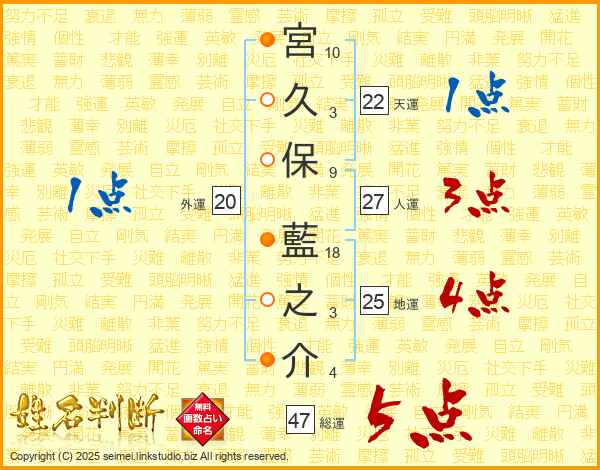 宮(10画)久(3画)保(9画) 藍(18画)之(3画)介(4画)