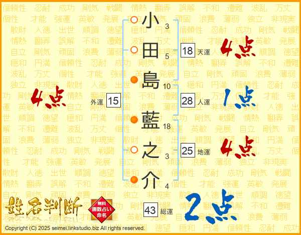 小(3画)田(5画)島(10画) 藍(18画)之(3画)介(4画)