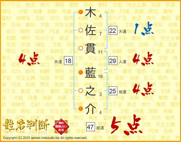 木(4画)佐(7画)貫(11画) 藍(18画)之(3画)介(4画)