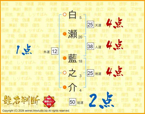 白瀬藍之介さんの天運は25画の4点!