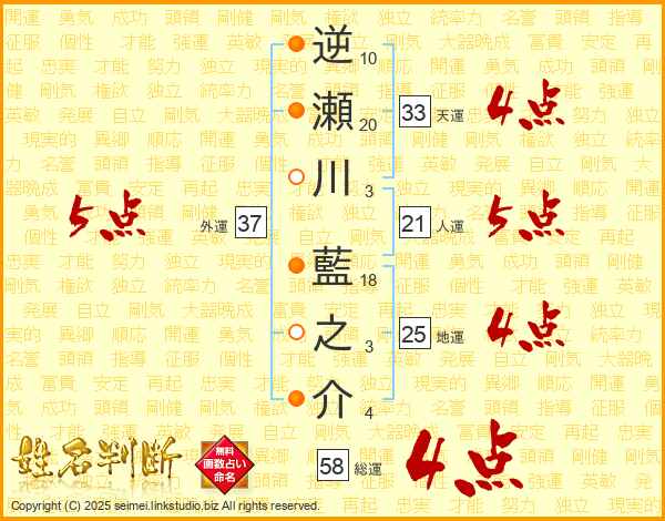 逆(10画)瀬(20画)川(3画) 藍(18画)之(3画)介(4画)