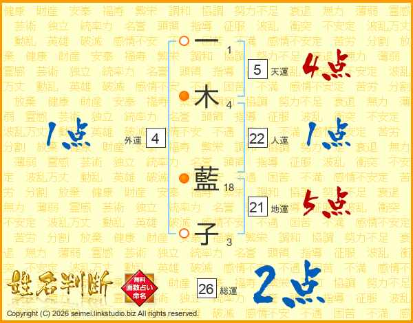 あなたの人生を表す1番重要な運勢です。生涯を通じて影響する総合運となり、主に50歳以降の晩年期に影響を及ぼします。苗字と名前の合計画数。