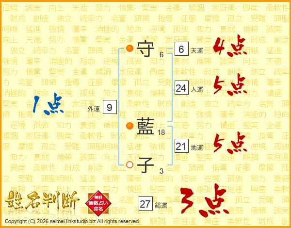 生活面を象徴する運勢です。外部から受ける影響力を表し、結婚運、家庭運や職場、環境への順応性を表します。総運から人運を引いた画数。姓や名が1文字の場合を除く。