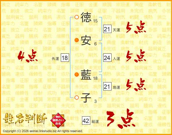 徳(15画)安(6画) 藍(18画)子(3画)