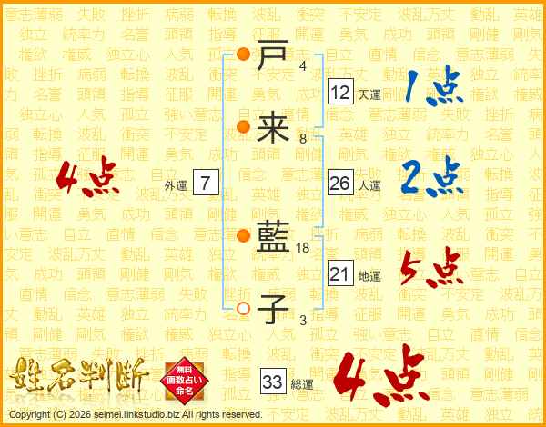 戸(4画)来(8画) 藍(18画)子(3画)