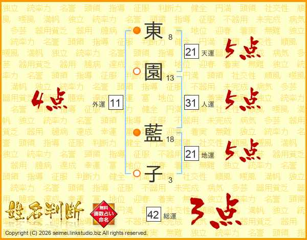 東(8画)園(13画) 藍(18画)子(3画)