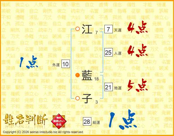 生活面を象徴する運勢です。外部から受ける影響力を表し、結婚運、家庭運や職場、環境への順応性を表します。総運から人運を引いた画数。姓や名が1文字の場合を除く。