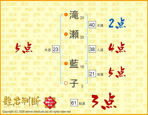 滝(20画)瀬(20画) 藍(18画)子(3画)
