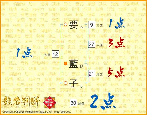 あなたの人生を表す1番重要な運勢です。生涯を通じて影響する総合運となり、主に50歳以降の晩年期に影響を及ぼします。苗字と名前の合計画数。