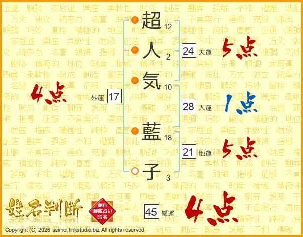 超(12画)人(2画)気(10画) 藍(18画)子(3画)
