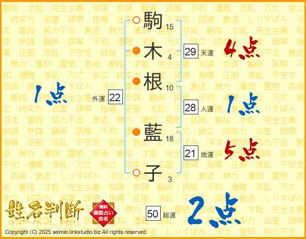 駒(15画)木(4画)根(10画) 藍(18画)子(3画)
