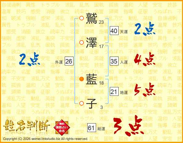 鷲(23画)澤(17画) 藍(18画)子(3画)