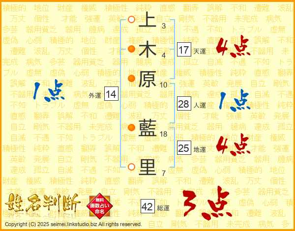 上(3画)木(4画)原(10画) 藍(18画)里(7画)