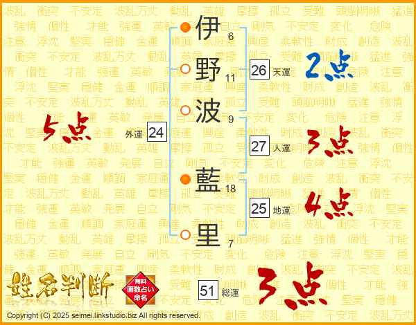 伊(6画)野(11画)波(9画) 藍(18画)里(7画)