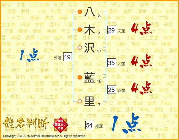 八(8画)木(4画)沢(17画) 藍(18画)里(7画)
