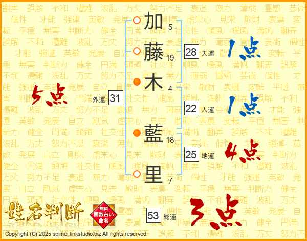 加(5画)藤(19画)木(4画) 藍(18画)里(7画)
