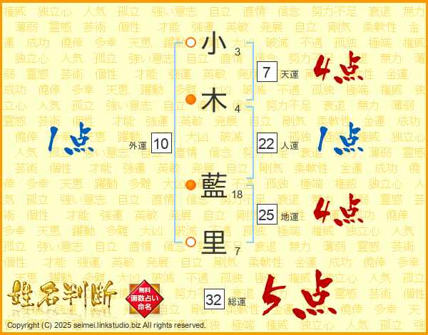 生活面を象徴する運勢です。外部から受ける影響力を表し、結婚運、家庭運や職場、環境への順応性を表します。総運から人運を引いた画数。姓や名が1文字の場合を除く。