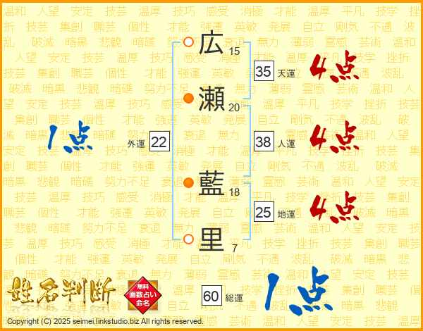 広(15画)瀬(20画) 藍(18画)里(7画)