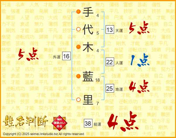 手(4画)代(5画)木(4画) 藍(18画)里(7画)