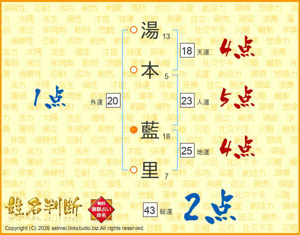 あなたの人生を表す1番重要な運勢です。生涯を通じて影響する総合運となり、主に50歳以降の晩年期に影響を及ぼします。苗字と名前の合計画数。